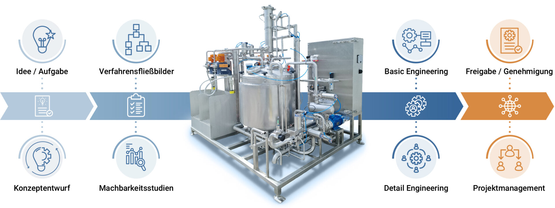 Die Planung beginnt mit einer Analyse der Prozessanforderungen, gefolgt von Konzeptentwicklung, Basic und Detail Engineering sowie Genehmigungs- und Sicherheitsplanung.