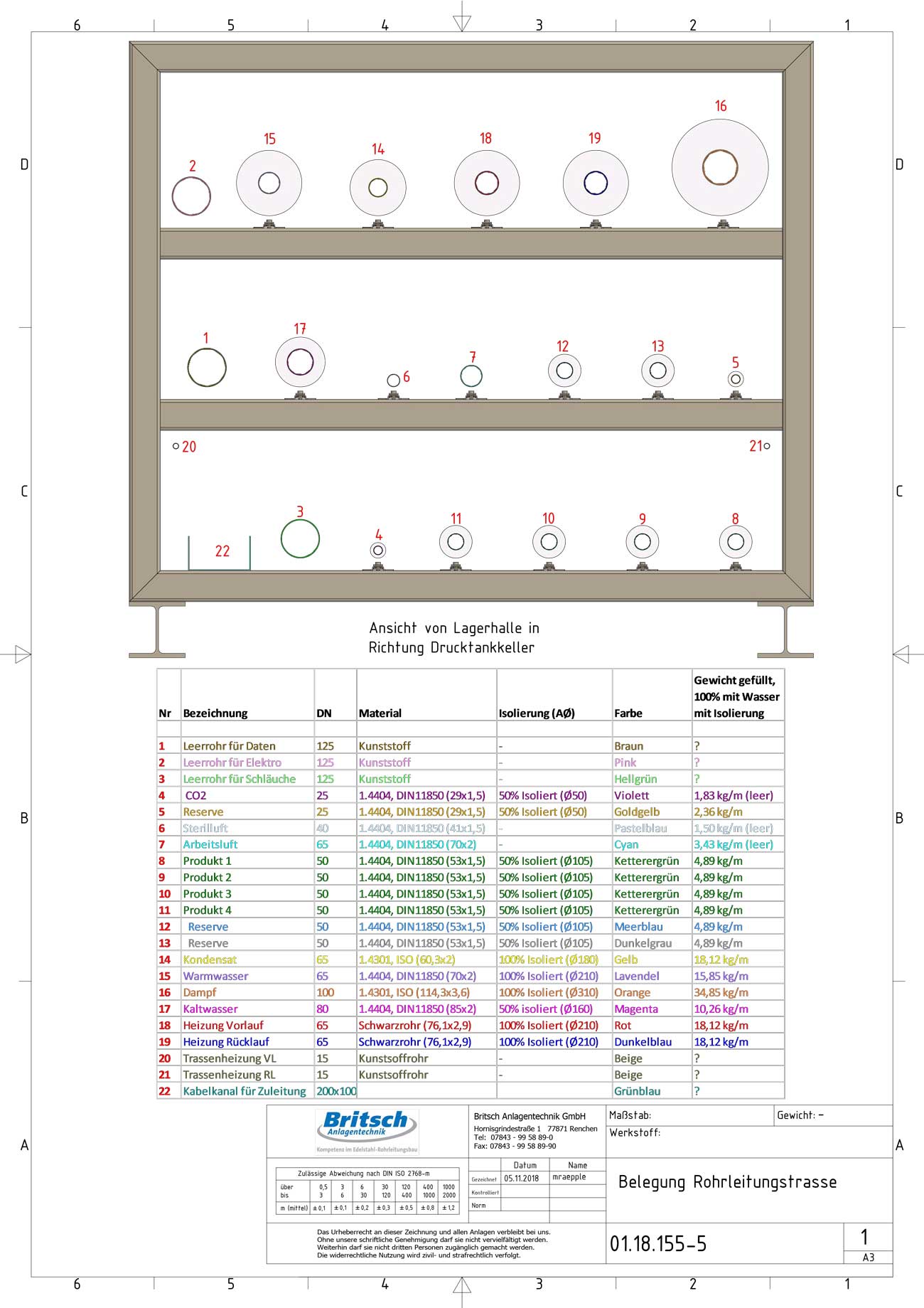 - Gesamtgewicht der isolierten und gefüllten Rohleitungen ca. 1,2T auf der Rohrtrasse.